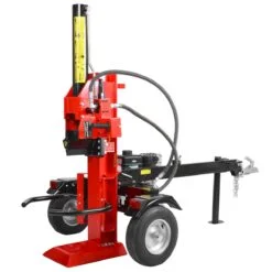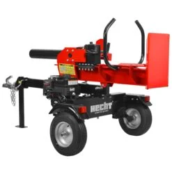 Hecht ATV Vedkløyver på tilhenger med kulekobling og egen bensinmotor. Vedkløyveren kan kløyve både horisontalt og vertikalt, og håndterer kløyvelengde opptil 63.5 cm.