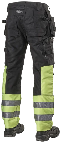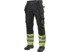 To hengelommer, to forlommer samt to baklommer. Innvendige knebeskyttelseslommer i to høydenivåer. Knivknapp, benlomme med klaff, tommestokklomme, blyantlomme, telefonlomme, to hammerbøyler samt ID-kortlomme.